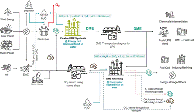 Steam reforming is used to extract the stored hydrogen in large quantities for industrial processes. To do this, the liquid energy carrier and water are brought into reaction in the gas phase. In addition to hydrogen, this mainly produces CO2. This can then be separated using a membrane, for example, and reused again in Power-to-X processes. An example cycle for dimethyl ether is shown in Figure 1: