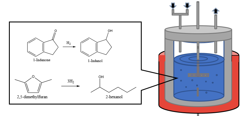 Using energy from hydrogen is a promising alternative to fossil fuels and pivotal in decarbonization efforts in industry and infrastructure. Selective hydrogenation of complex molecules is of special interest for this purpose. In this regard, development of catalysts and processes are in the focus of current research. In cooperation with FAU Erlangen, novel, phosphorus-modified metal catalysts are available. Phosphorus modification increases stability and changes selectivity behavior positively compared to commercially available catalysts. The aim of this project is the utilization of these novel catalysts for the development of a continuous hydrogenation process under mild conditions (T < 100 °C, p < 20 bar). For this purpose, the highly complex and industrially relevant reaction systems of 1-indanone and 2,5-dimethylfuran are to be investigated and optimized with respect to conversion and selectivity (see figure below). Besides the chemical background, reaction engineering parameters, such as fluid dynamics, and material and heat transportation are significant.